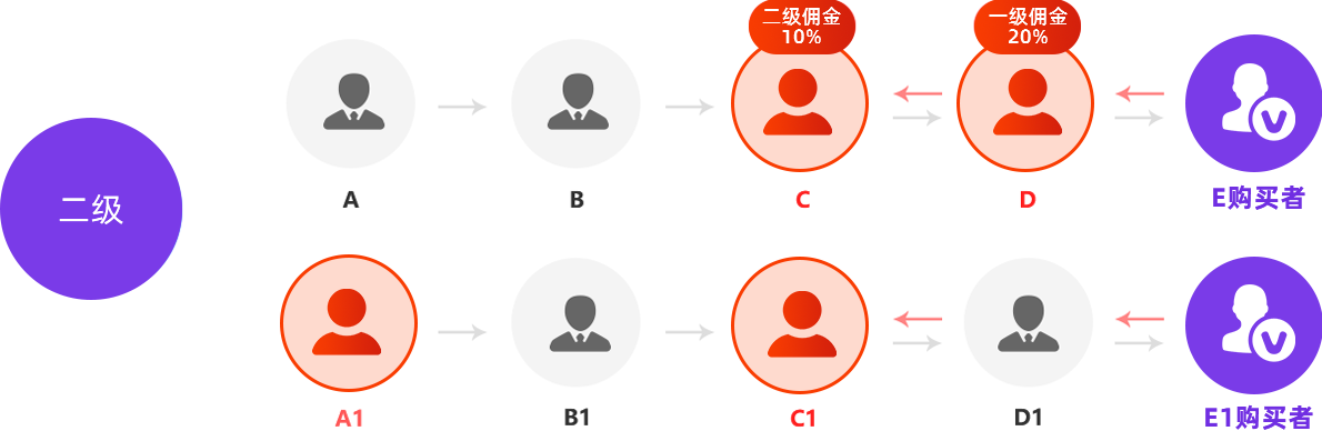 2、商品的价格200 E1购买,D1是会员不拿,C1拿20元。